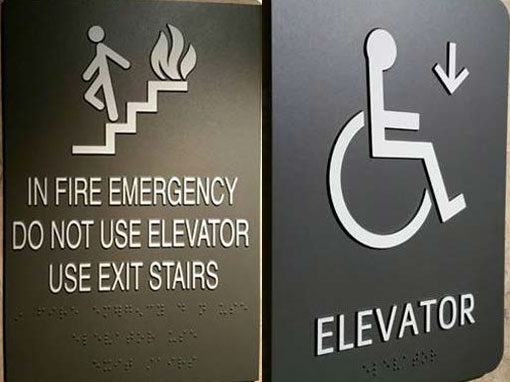 The ‘Fire Riser’ picture shows an example of a photopolymer ADA sign that is coming apart due to moisture. Photopolymer is a water etched, UV activated material.